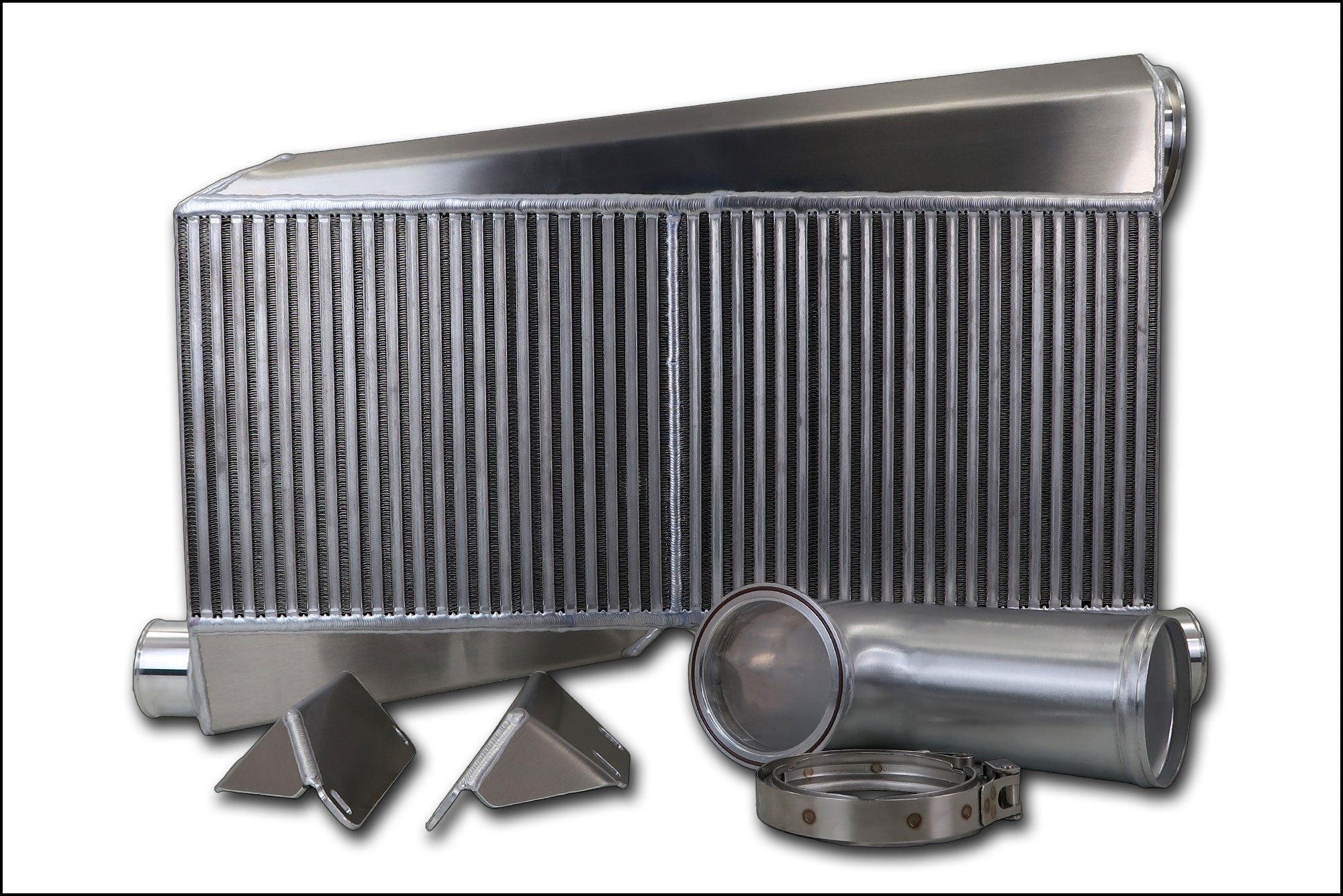 This twin turbo S550 Mustang Bolt-On Intercooler package includes our ultra efficient 1200hp intercooler, brackets, and an upper IC pipe. The foundation of this IC is a best in industry Garrett Intercooler Core outfitted with our aluminum air tanks, 2.5" Inlets, 3.5" VBand outlet, and a short upper IC pipe. Designed to mount to the existing bumper horns and to router the outlet pipe around the drivers side of the radiator. Quite possibly our most underrated Intercooler at 1200hp. Some customers have abused this intercooler upwards of 1600whp and it keeps up!