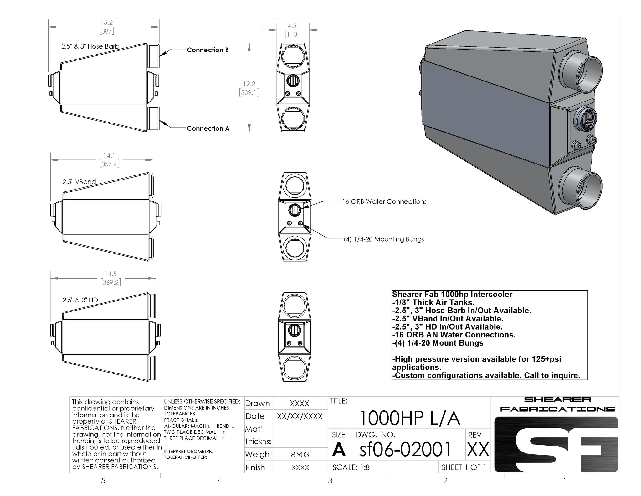This 1000hp capable intercooler is one of our newest additions to the A/W product line. A Garrett Intercooler core is the foundation of this intercooler. Proven time and again to be the absolute best intercooler cores on the market. Charge pipe connections are 3" HD. -16ORB fittings are the standard water connection fittings and also included are (4) 1/4-20 mount bungs welded onto the core.