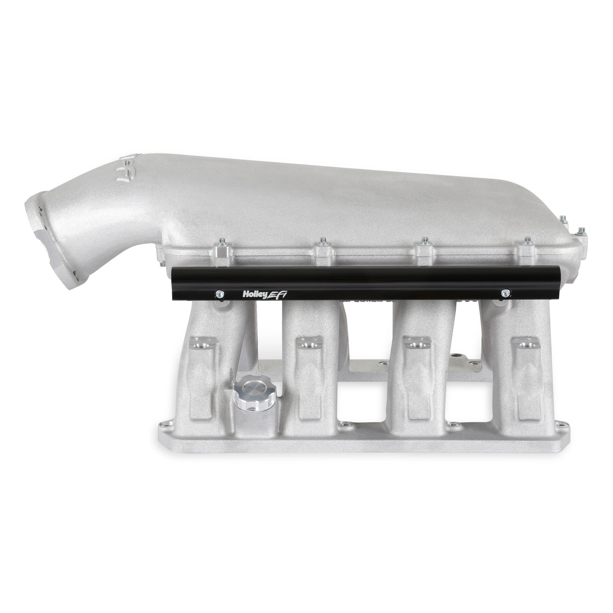 Add even more power to your Gen III Hemi engine with a Holley Hi-Ram intake manifold. This cast intake manifold has large intake ports - fits 2009-up 5.7L, 2005-2010 6.1L & 2011-up 6.4L engines. The EFI fuel rails are machined for -8AN O-ring fittings with passages large enough to accommodate high fuel flow and dampen pressure pulsations in the fuel system and come standard with EFI Hi-Ram kits. Intended for use on naturally aspirated, forced induction, or nitrous engines in the 5.7 to 7.2+ liter range, max power at 7500-8500 RPM. The Holley Hi-Ram intake manifold is for high-performance applications where induction system height is not limited. Using this Hi-Ram intake with high flowing Gen III Hemi cylinder heads has outstanding potential for naturally aspirated & forced induction applications. Aggressive, bold, race-bred styling will make bad intentions clear for drag race, muscle car, marine, off-road, sandrails, pulling trucks, track, street-rod applications and more! The base is designed to be modular in configuration to accept a wide range of EFI tops and to be attractive to builders and fabricators as the foundation for custom induction systems. Runner length and the tapered cross-section designed to perform well for a wide range of engine configurations.