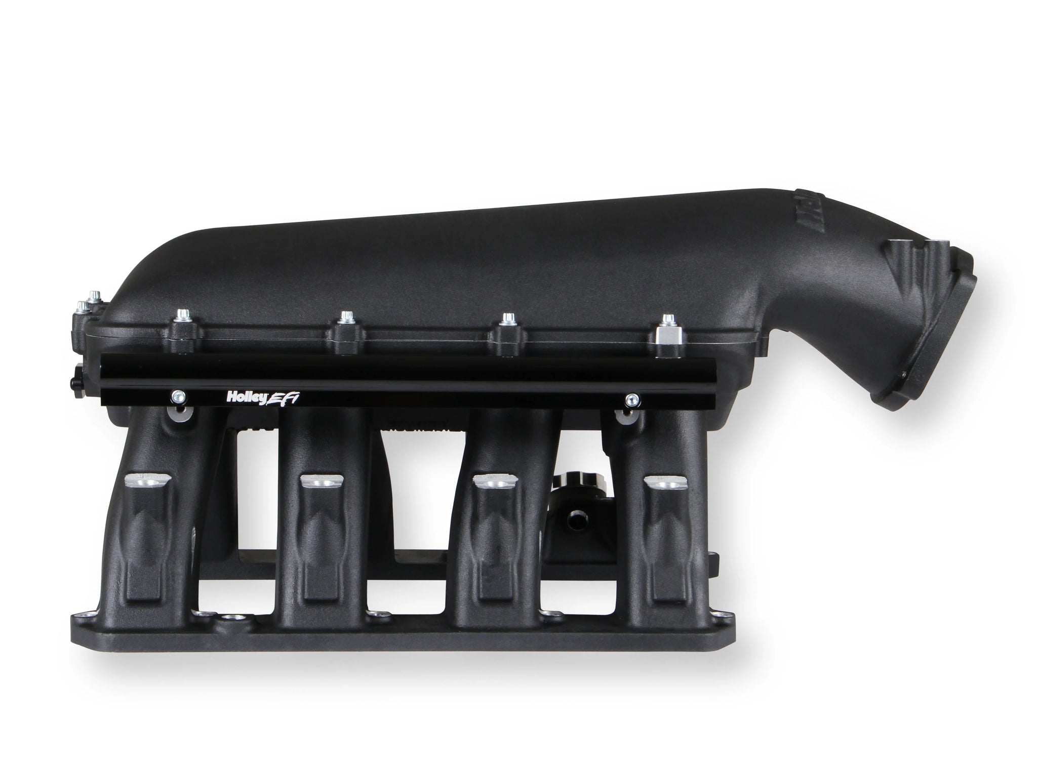 The base is designed to be modular in configuration to accept a wide range of EFI tops and to be attractive to builders and fabricators as the foundation for custom induction systems. Runner length and the tapered cross-section designed to perform well for a wide range of engine configurations. Add even more power to your Gen III Hemi engine with a Holley Hi-Ram intake manifold. This cast intake manifold has large intake ports - fits 2009-up 5.7L, 2005-2010 6.1L & 2011-up 6.4L engines. The EFI fuel rails are machined for -8AN O-ring fittings with passages large enough to accommodate high fuel flow and dampen pressure pulsations in the fuel system and come standard with EFI Hi-Ram kits. The Holley Hi-Ram intake manifold is for high-performance applications where induction system height is not limited. Using this Hi-Ram intake with high flowing Gen III Hemi cylinder heads has outstanding potential for naturally aspirated & forced induction applications. Aggressive, bold, race-bred styling will make bad intentions clear for drag race, muscle car, marine, off-road, sandrails, pulling trucks, track, street-rod applications and more! Intended for use on naturally aspirated, forced induction, or nitrous engines in the 5.7 to 7.2+ liter range, max power at 7500-8500 RPM.