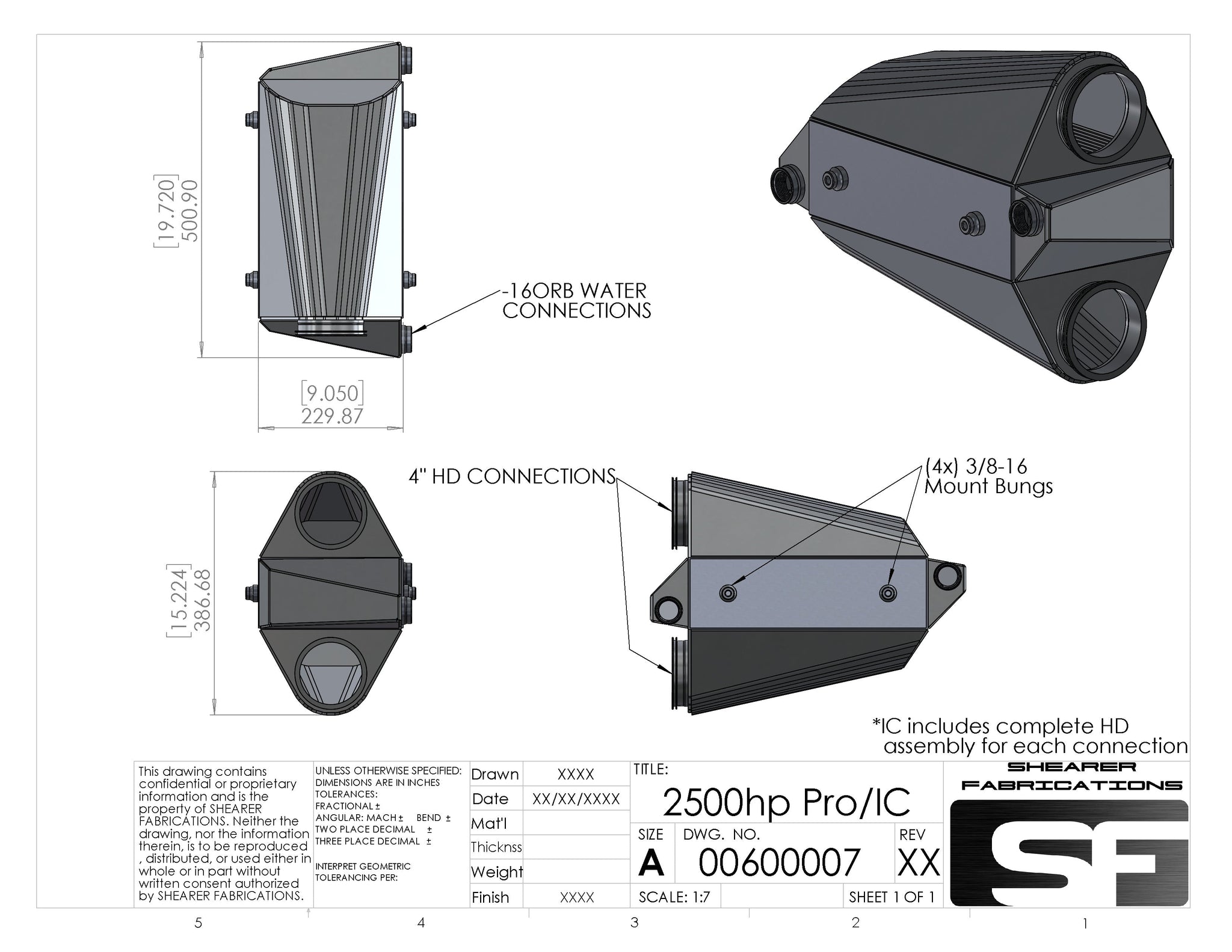 Shearer Fab's Pro/IC 2500+hp intercooler is one of the industries best performing intercoolers. We have invested a lot of time, money and resources into bringing one of the absolute best intercooler cores on the market to life. The radially formed 3/16" thick air tanks are the strongest air tanks in the industry and are welded to an extremely strong core frame making for a robust big boost ready package. Capable of supporting sustained boost pressures of 100psi!