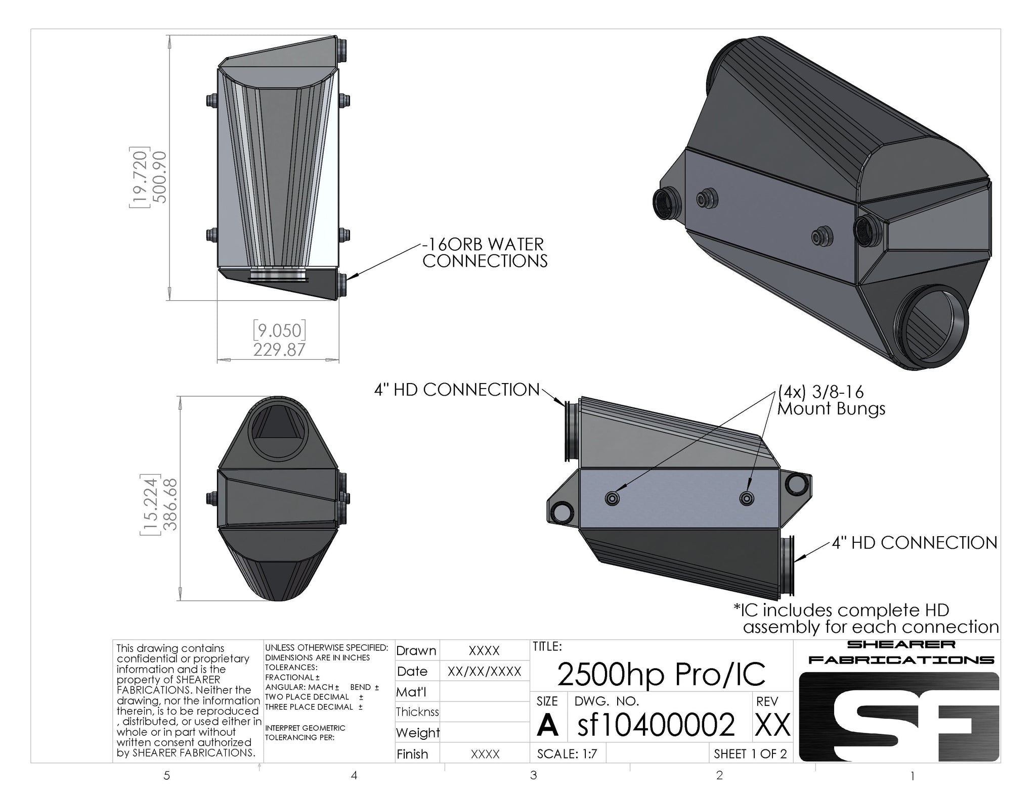 Shearer Fab's Pro/IC 2500+hp intercooler is one of the industries best performing intercoolers. We have invested a lot of time, money and resources into bringing one of the absolute best intercooler cores on the market to life. The radially formed 3/16" thick air tanks are the strongest air tanks in the industry and are welded to an extremely strong core frame making for a robust big boost ready package. Capable of supporting sustained boost pressures of 100psi!