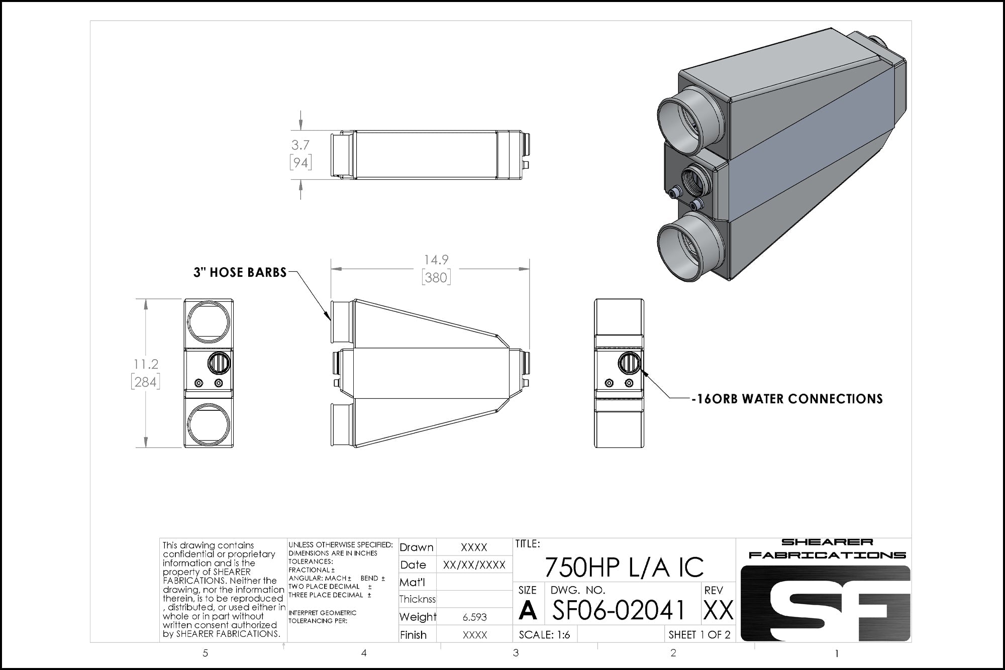 This 750hp capable intercooler is one of our newest additions to the Air2Water line product line. Garrett Intercooler cores are the foundation of this intercooler. Proven time and again to be the absolute best intercooler cores on the market. Charge pipe connections are in 3" diameter Hose Barb. -16ORB fittings are the standard water connection fittings and also include (4) 1/4-20 mount bungs welded onto the core.