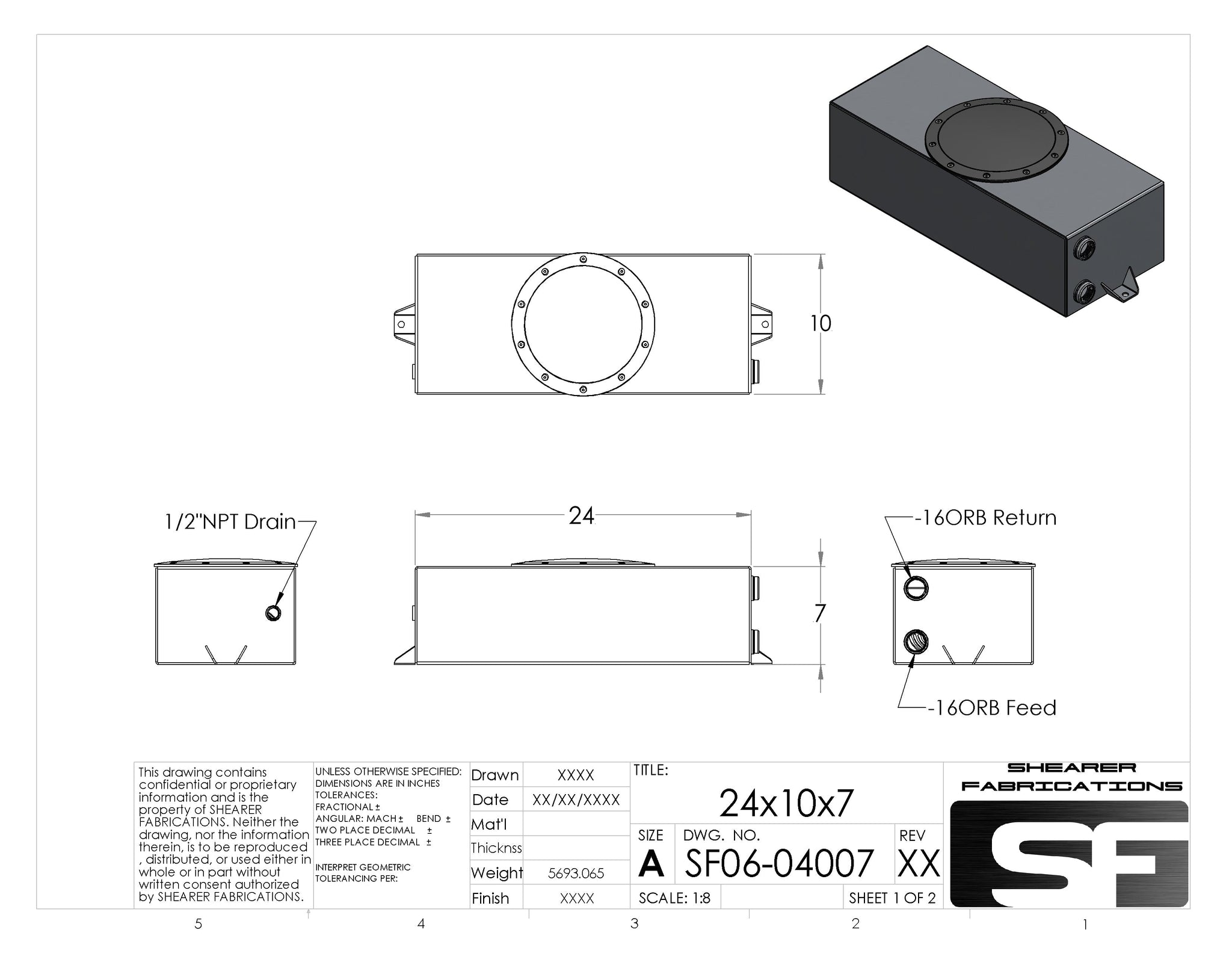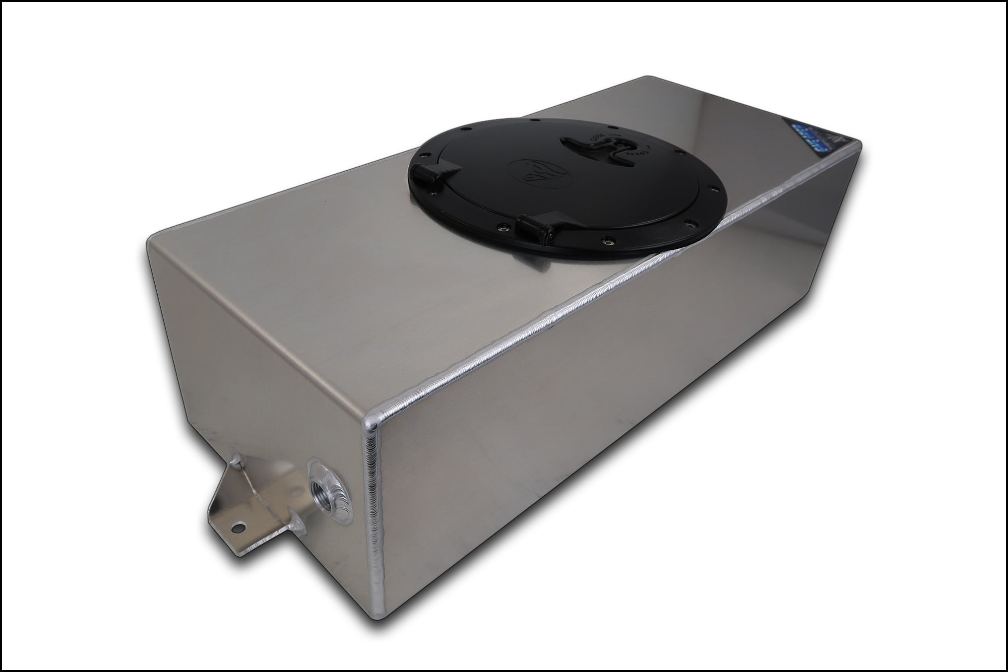 Shearer Fab 6.7 Gal water tank. Uses a hinged flip top lid with integrated cam lock. Designed for use with external water pumps. Completely constructed in house from US processed 1/8" aluminum.